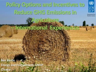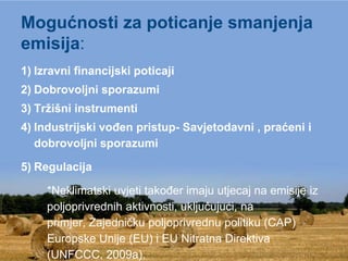 Dokument istražuje opcije i poticaje za smanjenje emisija stakleničkih plinova u poljoprivredi, uključujući financijske potpore, dobrovoljne sporazume i tržišne instrumente. Navode se primjeri iz različitih zemalja, kao što su savjetodavne usluge te regulacije putem emisijskih standarda. Također se ističe utjecaj neklimatskih uvjeta i politike EU na emisije u sektoru poljoprivrede.
