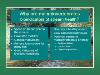 This document discusses using aquatic macroinvertebrates to monitor water quality. It outlines how macroinvertebrates can indicate the health of bodies of water, explains how they are classified by their tolerance to pollution, and describes how to sample, sort, identify, and calculate a Benthic Index of Biotic Integrity score. The sampling process involves collecting macroinvertebrates from different habitats using nets and grab samplers, preserving the samples, sorting and identifying the organisms, and calculating the score to assess the water quality and detect problems.