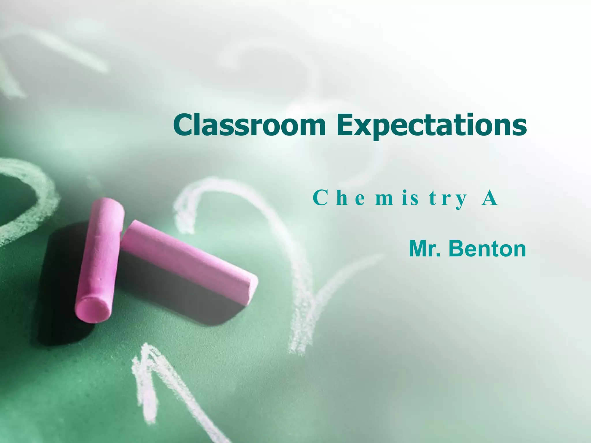 Mr. Benton outlines his expectations for his chemistry class. Students are expected to arrive on time with their interactive notebooks, follow all classroom rules and procedures, complete all assignments, and participate actively. Their grade will be determined by test scores, daily work, lab assignments, and homework. Students must request help if they fall behind and can attend tutorials after school or at lunch. Mr. Benton looks forward to a successful year with his students.