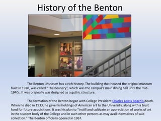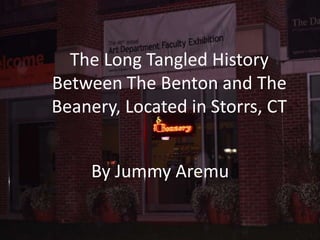 The document summarizes the history between the Benton Museum and the Beanery building in Storrs, Connecticut. Originally called the Beanery, the building was the campus's main dining hall until the 1940s and then housed the Benton Museum from the 1960s. It was renamed the Beanery in 2010 when the on-campus cafe changed its name. The Benton Museum has a collection of over 5,500 American artworks established by donations from Charles Beach and William Benton and hosts special exhibits and events.