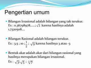 Dokumen ini membahas tentang bilangan irrasional dan rasional serta bentuk akar yang melibatkan operasi aljabar. Terdapat penjelasan mengenai penjumlahan, pengurangan, dan perkalian bentuk akar serta cara merasionalkan penyebut pecahan. Selain itu, dokumen juga menyentuh tentang pangkat pecahan dan penerapan sifat bilangan pangkat dalam konteks tersebut.