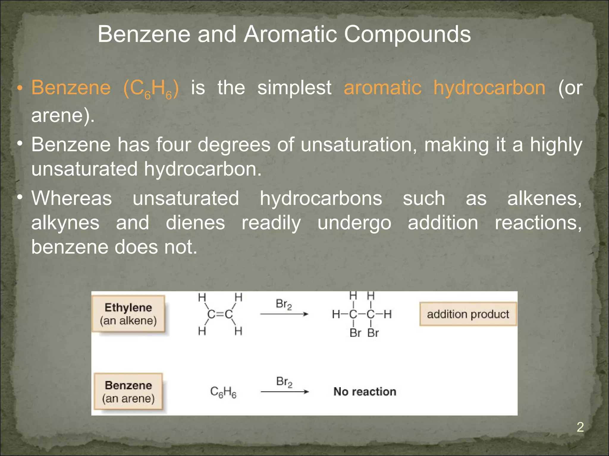 The document discusses the properties and structure of benzene (C6H6). It explains that benzene is planar and has resonance structures with delocalized pi electrons. This delocalization contributes to benzene's unusual stability compared to other unsaturated hydrocarbons. The document also introduces Kekulé structures and describes how current models of benzene are based on resonance and electron delocalization rather than distinct single and double bonds. It discusses how benzene's properties satisfy criteria for aromaticity including being cyclic, planar, fully conjugated, and having 4n+2 pi electrons as per Hückel's rule.