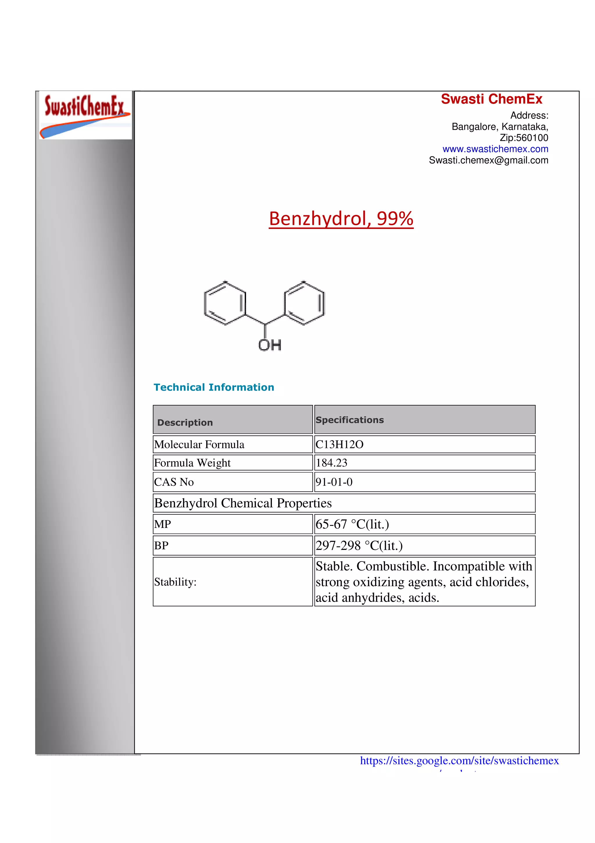 Swasti ChemEx is a chemical company located in Bangalore, India that produces Benzhydrol at 99% purity. Benzhydrol has a molecular formula of C13H12O, molecular weight of 184.23, and CAS number of 91-01-0. It has a melting point of 65-67 °C and boiling point of 297-298 °C. Benzhydrol is stable but combustible and incompatible with strong oxidizing agents, acid chlorides, acid anhydrides, and acids.