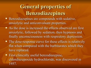 The document summarizes properties and uses of benzodiazepines. It discusses how benzodiazepines act by potentiating GABA, have sedative, anxiolytic and anticonvulsant properties, and replaced barbiturates due to a safer profile. It describes the classification, pharmacokinetics, mechanisms of action, and uses of various benzodiazepines like diazepam, midazolam and lorazepam in conditions like anxiety, insomnia, muscle relaxation and as anticonvulsants. It also notes potential adverse effects with high doses or interactions.
