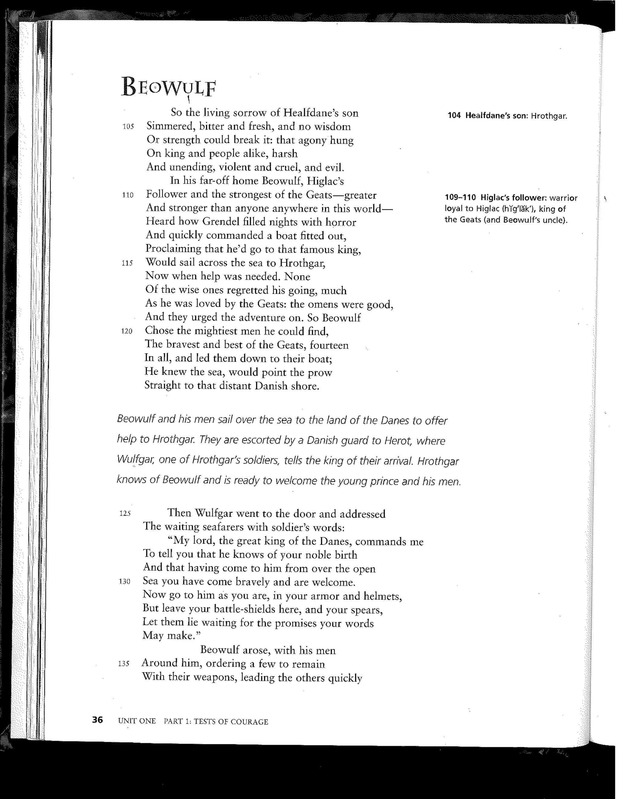 Beowulf and his men sail from Geatland to Denmark to help King Hrothgar and his people. They are escorted to the royal hall, Heorot, where Beowulf offers to fight Grendel alone and with his bare hands. He boasts of his past victories over monsters and giants. King Hrothgar accepts Beowulf's offer, hoping he can end Grendel's attacks, and invites Beowulf and his men to a feast in their honor.