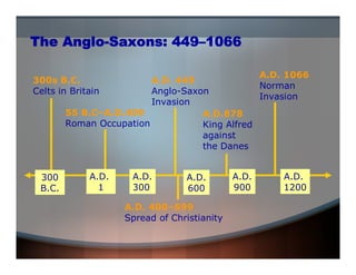 The document provides an overview of the Anglo-Saxon period in Britain from 449 to 1066 CE. It describes the Celtic tribes who originally inhabited Britain, the Roman occupation from 55 BCE to 409 CE, and the Anglo-Saxon invasion starting in 449 CE which pushed the Celts into the western regions. It also discusses the spread of Christianity between 400-699 CE, King Alfred the Great's unification of England against the Danish invaders between 871-878 CE, and the Norman invasion in 1066 CE. The document provides context on Anglo-Saxon society, culture, religion, and the important role of scops or bards. It introduces some of the key literary works from this period including Beowulf and