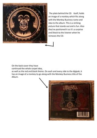 The album is called Monkey Business by the Black Eyed Peas. It has a red and black color scheme throughout the digipak packaging to make it eye-catching and distinctive. The album cover features the four band members against a red carpet background continuing the animal theme from their previous album "Elephunk". Images and patterns of monkeys are used throughout the packaging to reinforce the album's title of Monkey Business.