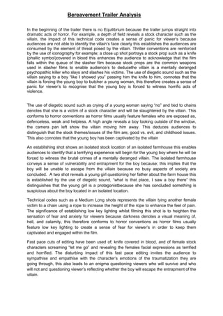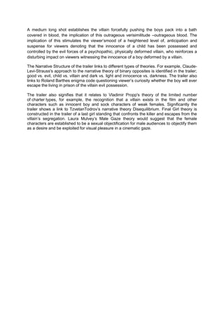 The trailer establishes disequilibrium and a sense of panic by not showing the villain's face clearly. It reinforces thriller conventions through the use of iconography like a bloody knife. Technical elements like low key lighting and fast editing are used to create fear and engage the audience. The narrative structure links to various theories around binaries, enigmas, character types, and disequilibrium to set up themes of good vs evil, innocence vs darkness, and whether the boy can escape the villain's control.