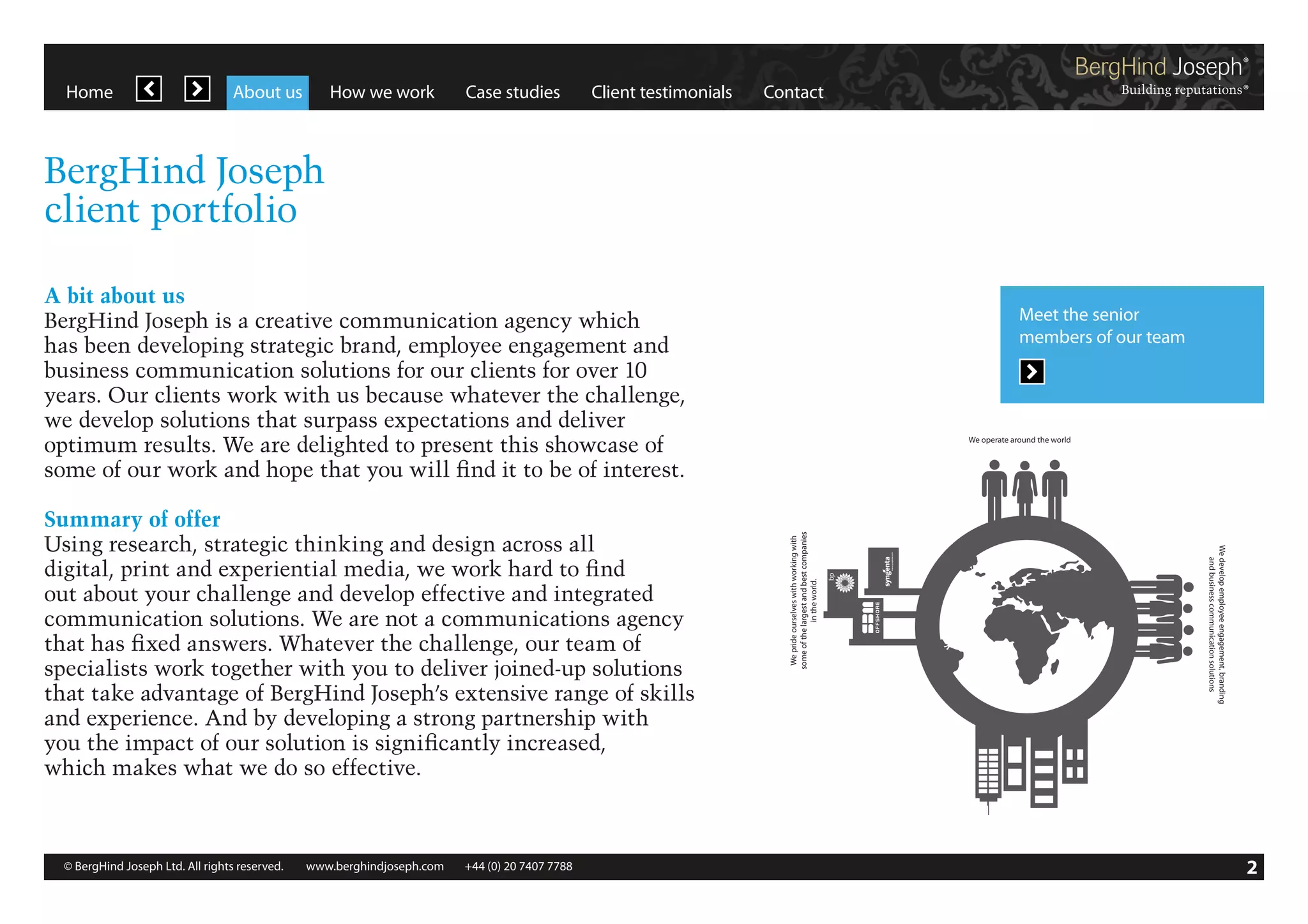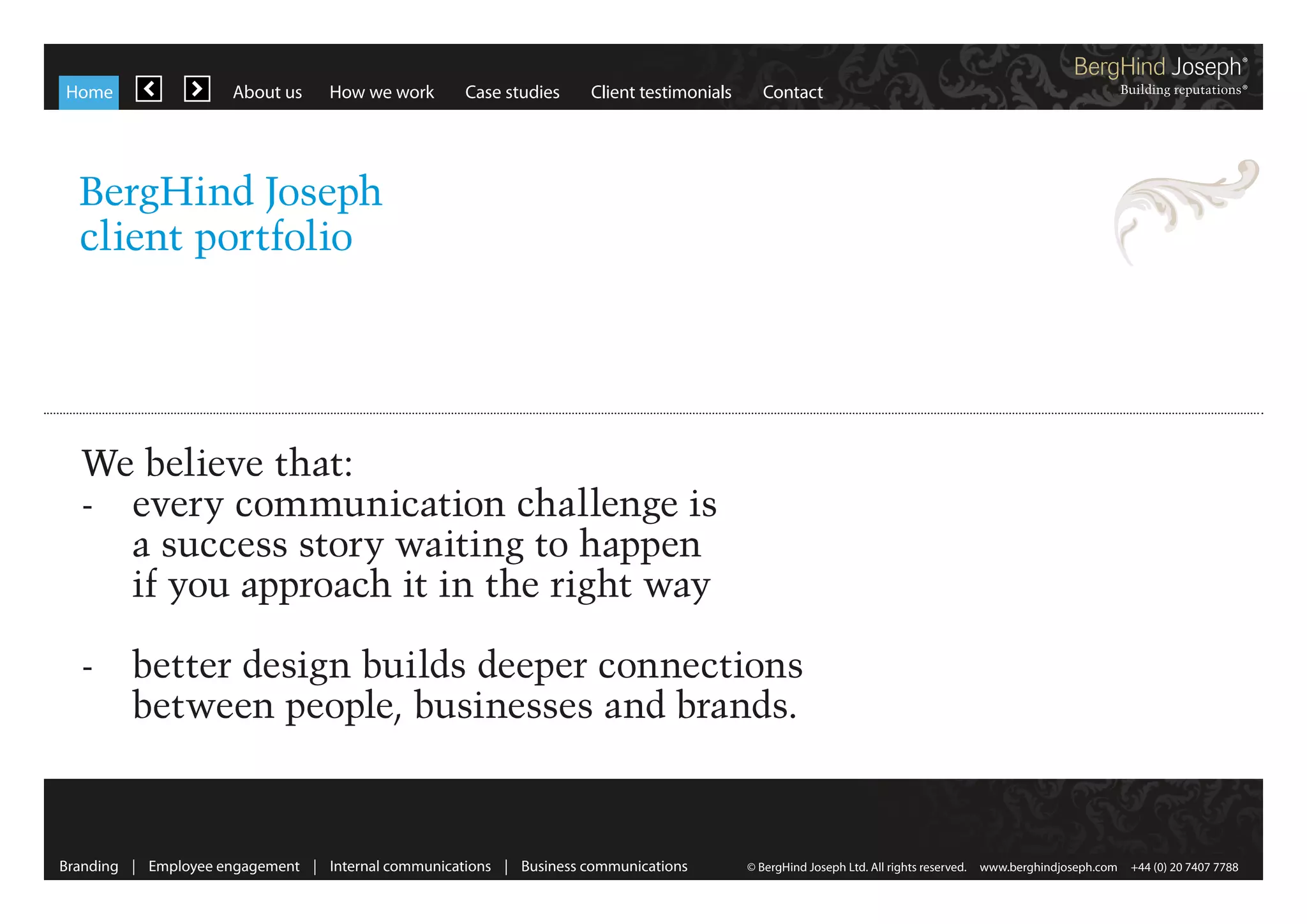 Berghind Joseph is a creative communication agency focused on delivering strategic branding, employee engagement, and business communication solutions globally. With a collaborative approach, they develop customized communication strategies that prioritize research, understanding audiences, and effective design to achieve measurable results for clients, which include some of the world's leading companies. Their services encompass a range of offerings like branding, internal communications, and marketing strategies, aimed at enhancing employee engagement and overall business performance.