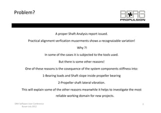 The document discusses the performance prediction of shafts, particularly focusing on problems related to shaft alignment and whirling vibrations. It emphasizes the impact of bearing stiffness on bearing loads and shaft slopes in marine propulsion systems, with case studies revealing how variations in stiffness affect system performance. Furthermore, the document introduces a study on lateral vibrations and the importance of understanding natural frequencies in the context of maintaining optimal operational conditions.