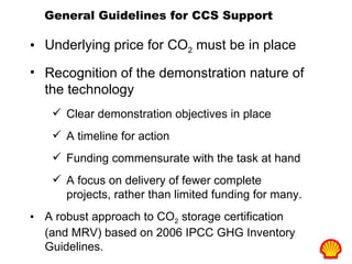 The document outlines guidelines for financing Carbon Capture and Storage (CCS) technology in the EU and internationally, emphasizing the need for a clear price for CO2, demonstration objectives, and focused funding for complete projects. It highlights the importance of establishing robust certification for CO2 storage and aims to replicate the CCS model globally, with a focus on developing countries. The document also discusses the evolution of carbon markets and the need for institutional capacity building to support CCS initiatives.