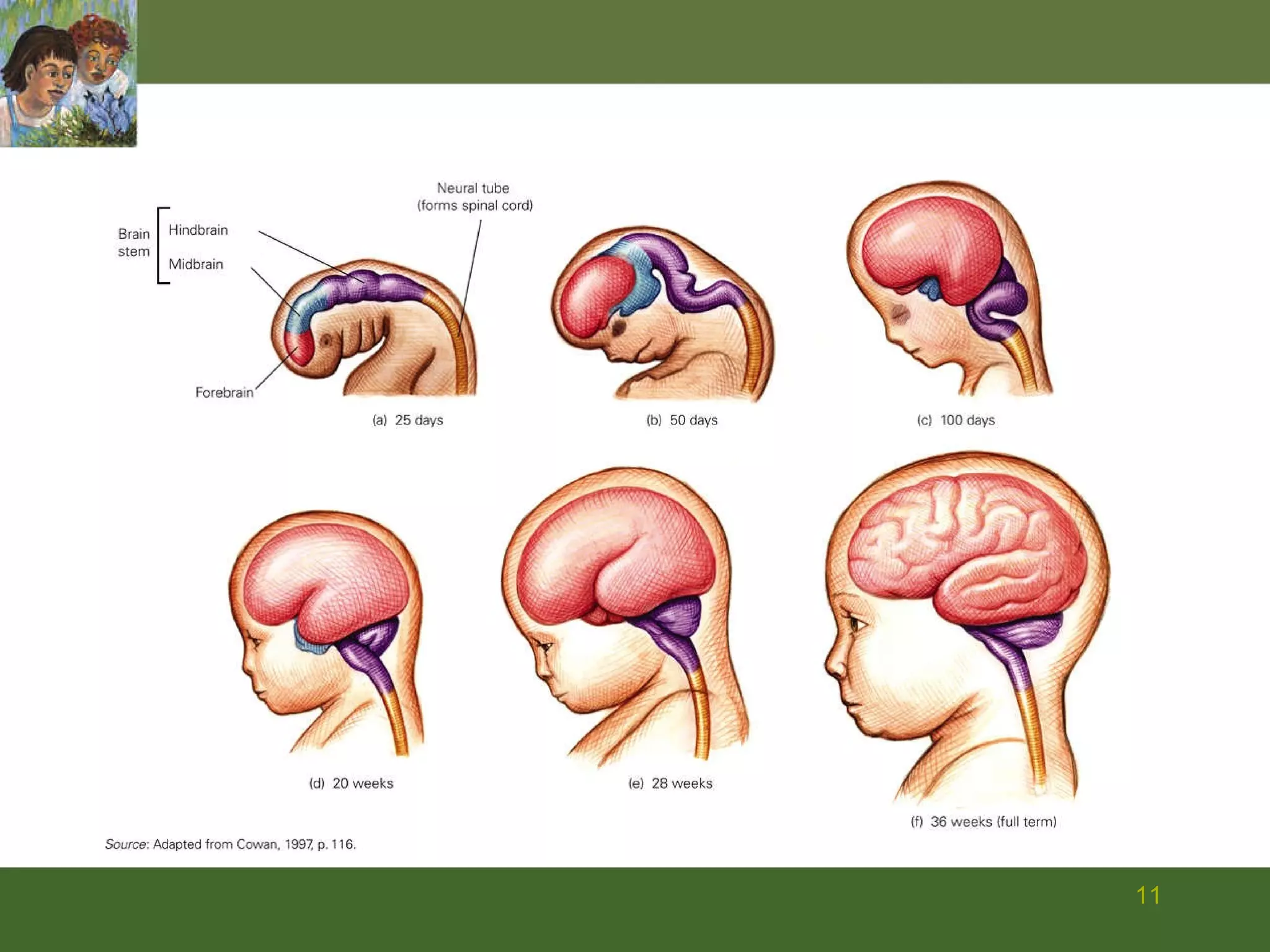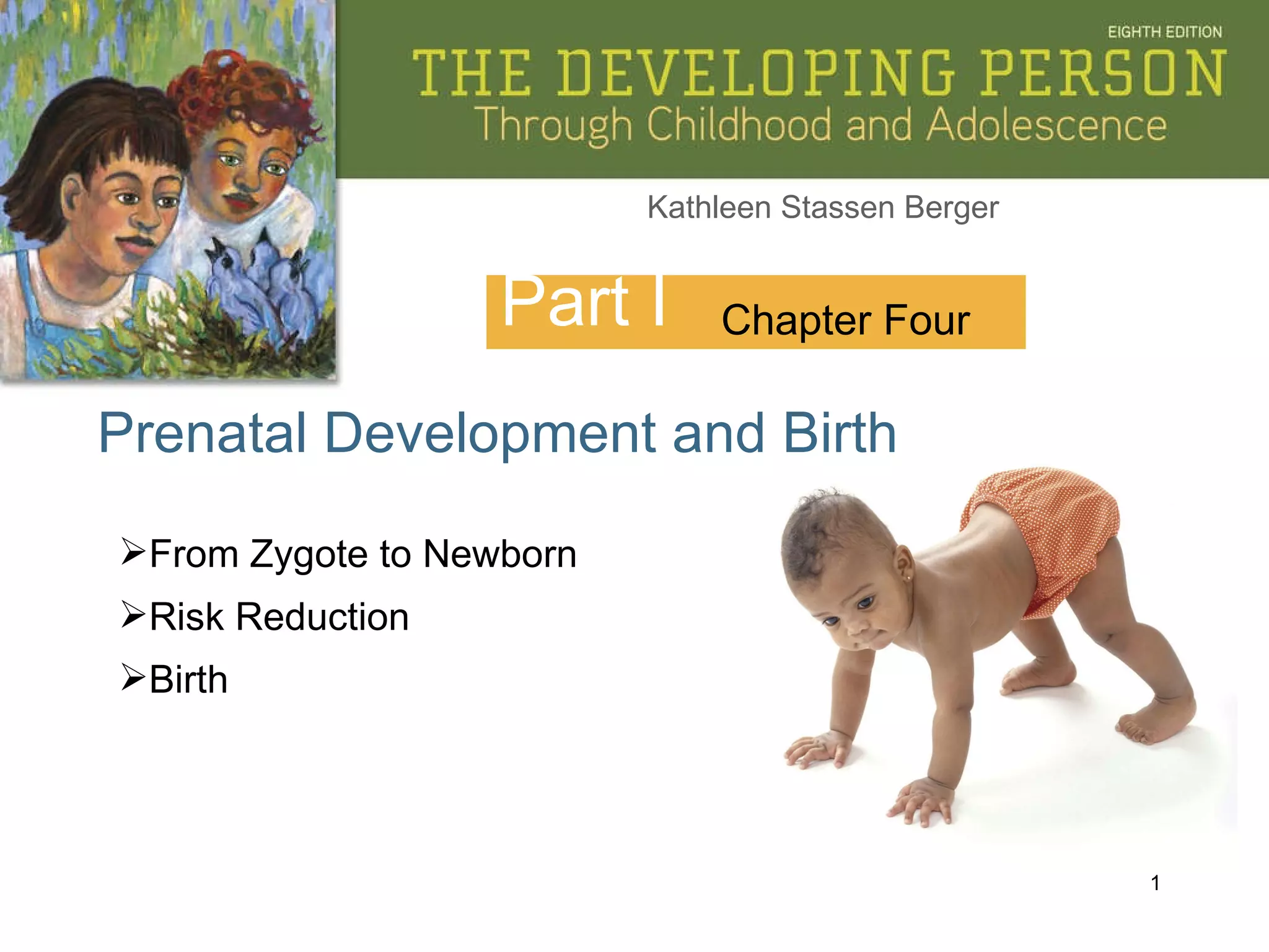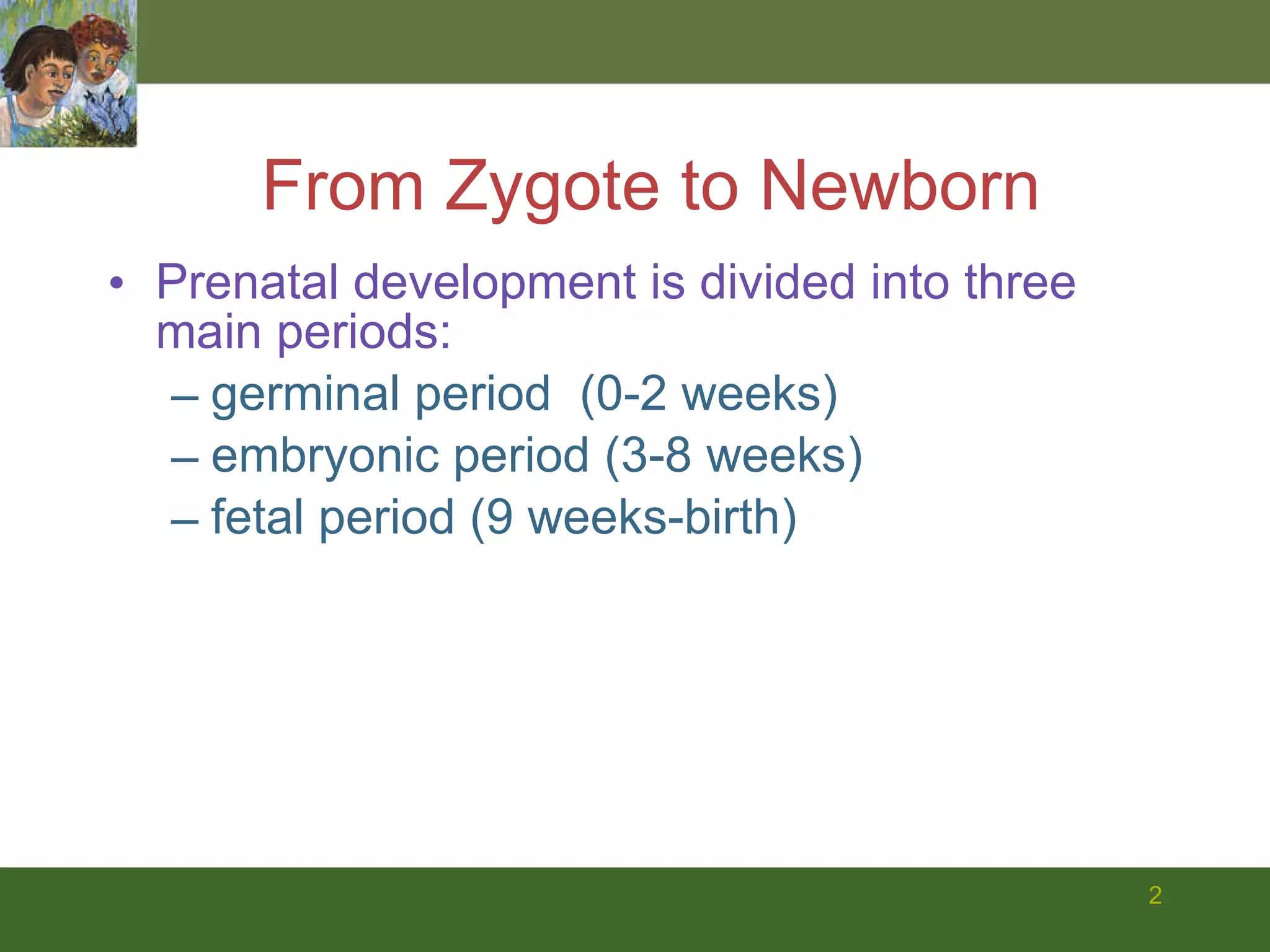 The document summarizes prenatal development from conception through birth. It describes the germinal, embryonic, and fetal periods and key developmental milestones. Risks to the developing fetus from genetic factors, environmental teratogens, and birth complications are discussed. The challenges of preterm birth and low birthweight are also covered.