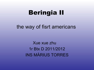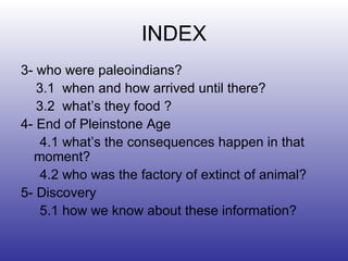 The document summarizes information about Paleoindians, the first humans to arrive in North America. It discusses that Paleoindians crossed the Bering land bridge from Siberia to Alaska around 40,000 years ago. They hunted large animals like horses and bison for food. Around 11,700 years ago, the end of the last ice age caused many animal species to go extinct, creating food problems for Paleoindians. Excavations at sites like the La Brea Tar Pits since the early 1900s have provided information about Paleoindian life through fossils recovered from the tar deposits.