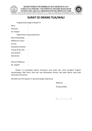 Surat izin ini memberikan persetujuan orang tua/wali untuk mengizinkan mahasiswa/alumni mengikuti program pendampingan SMK tahun 2014 yang diselenggarakan Fakultas Teknik Universitas Negeri Makassar. Surat ini berisi identitas siswa beserta alamat asal dan di Makassar serta pernyataan kesediaan ditempatkan di daerah manapun sesuai ketentuan panitia.