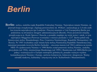 Berlin- stolica, siedzibarządu Republiki Federalnej Niemiec. Największe miasto Niemiec, na