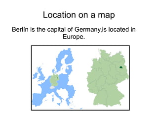 Berlin is the capital of Germany located in Europe. The official language is German and the currency is the Euro. Berlin has a continental climate with warm summers and very cold winters. Air travel is a common way to travel long distances. Berlin was formed by the union of two cities and has a history of being divided by The Berlin Wall which was constructed by East Germany to prevent migration to West Germany and was torn down in 1989. Major attractions include museums on Museum Island which has several famous museums and is a UNESCO World Heritage Site.