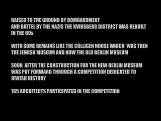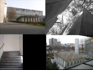The Jewish Museum in Berlin was built between 1993-1998 on the site of the former Kollegienhaus, which previously housed the Jewish Museum. An international competition was held in 1989 to design the new museum dedicated to Jewish history. Daniel Libeskind's radical zigzag design, nicknamed 'Blitz', was selected. The empty museum was completed in 1999 and attracted over 350,000 visitors before opening in 2001. Libeskind's design uses voids and sharp angles to represent the violence and rupture in German-Jewish history.