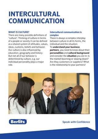 Culture is a shared system of attitudes, values, ideas, customs, beliefs and behaviors that is influenced by factors like education, geography and history. However, individual personality also plays a role in behavior. Intercultural communication is complex, as there is an interplay between culture, the individual, and the situation. To understand business partners, one needs to consider their personalities, cultural backgrounds, and the current business situation. Developing intercultural competence involves observing cultural differences, enjoying intercultural encounters, learning cultural histories, avoiding stereotypes, and respecting differences while adapting one's own behavior.