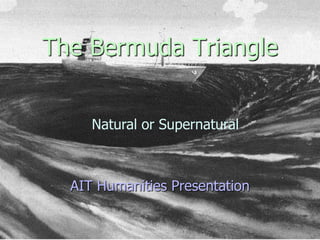 The document summarizes information about the Bermuda Triangle, a region of the western Atlantic Ocean where a number of aircraft and ships are said to have disappeared under mysterious circumstances. It discusses several theories for what may have caused disappearances in the region, including natural phenomena like methane gas eruptions, as well as supernatural explanations. However, the document notes that upon closer examination, many reported disappearances did not actually occur inside the Bermuda Triangle or can be explained by more rational factors. While strange events continue to be reported in the area, the number of incidents is proportionate to the amount of maritime traffic and not necessarily extraordinary or unexplained.
