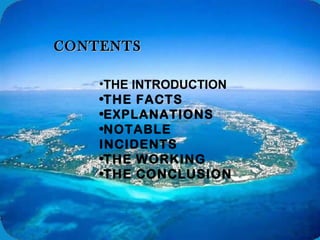The Bermuda Triangle is an area of the Atlantic Ocean where a number of aircraft and ships are said to have disappeared under unknown circumstances. It covers over 1.5 million square miles off the coast of Florida. The origins of theories about strange disappearances in the area can be traced back to 1942 when Christopher Columbus reported his compass behaving strangely and seeing a fireball crash into the sea in the region. Later articles in the 1950s first suggested there was something supernatural about disappearances like that of Flight 19 and argued they were part of a pattern of strange events in the Bermuda Triangle.