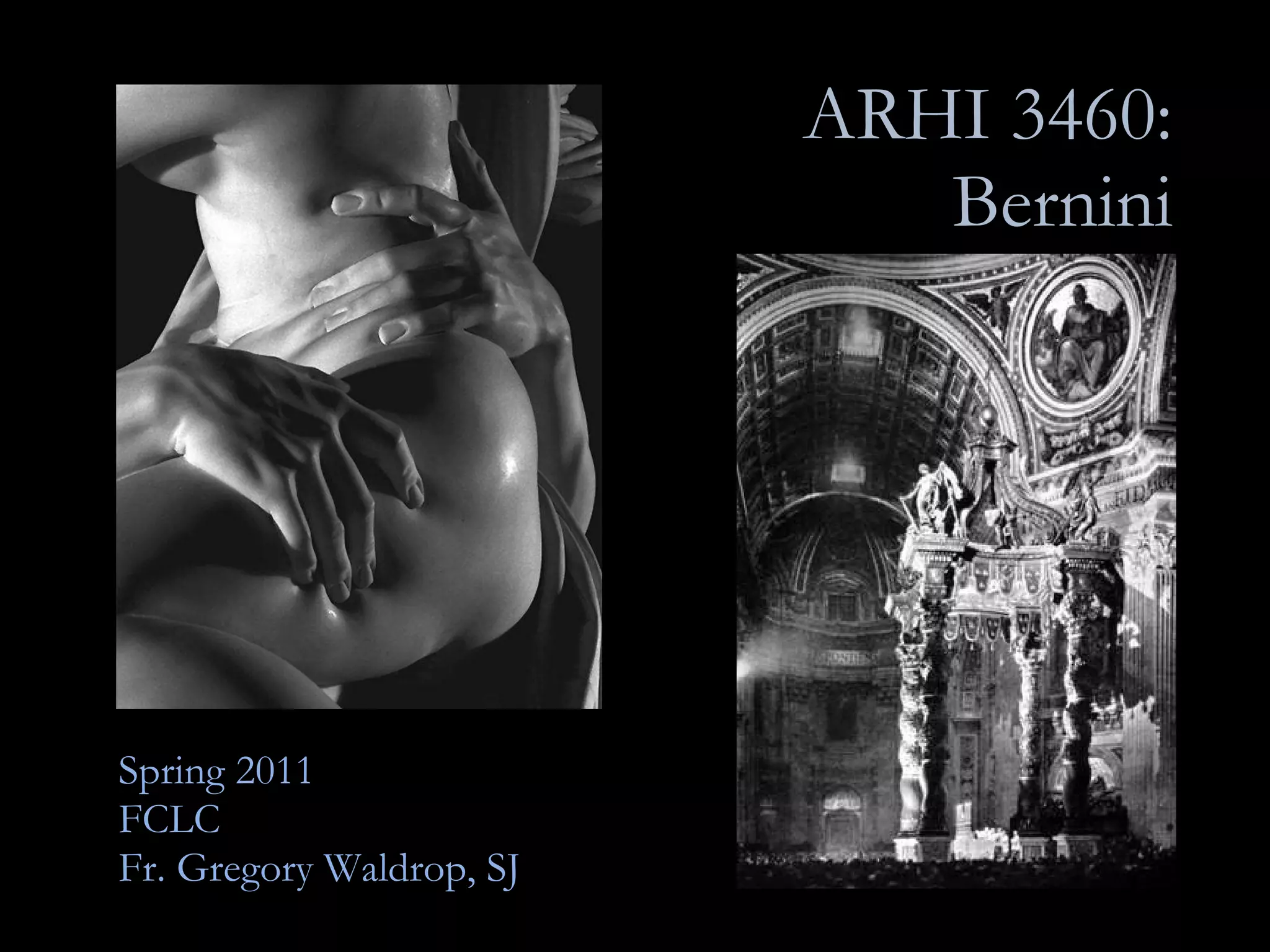 This document provides information about an art history course on Gian Lorenzo Bernini taught in the spring of 2011. It lists the instructor, Fr. Gregory Waldrop, SJ, and includes a self-portrait of Bernini. The syllabus is available in hard copy. The next class will introduce the Baroque period and discuss a chapter on the question of style, with student reporters, respondents, and questions to follow the instructor's concluding remarks.