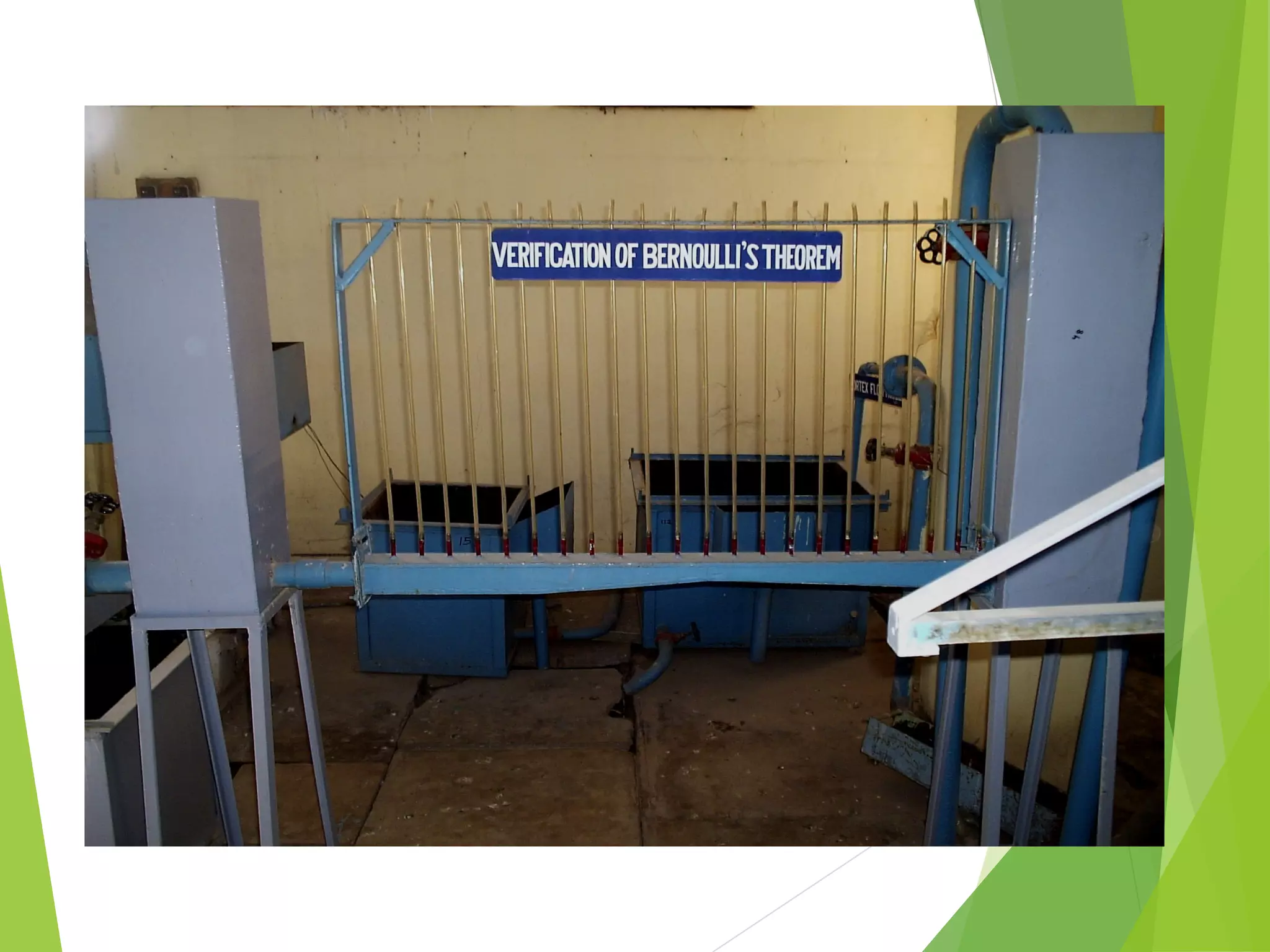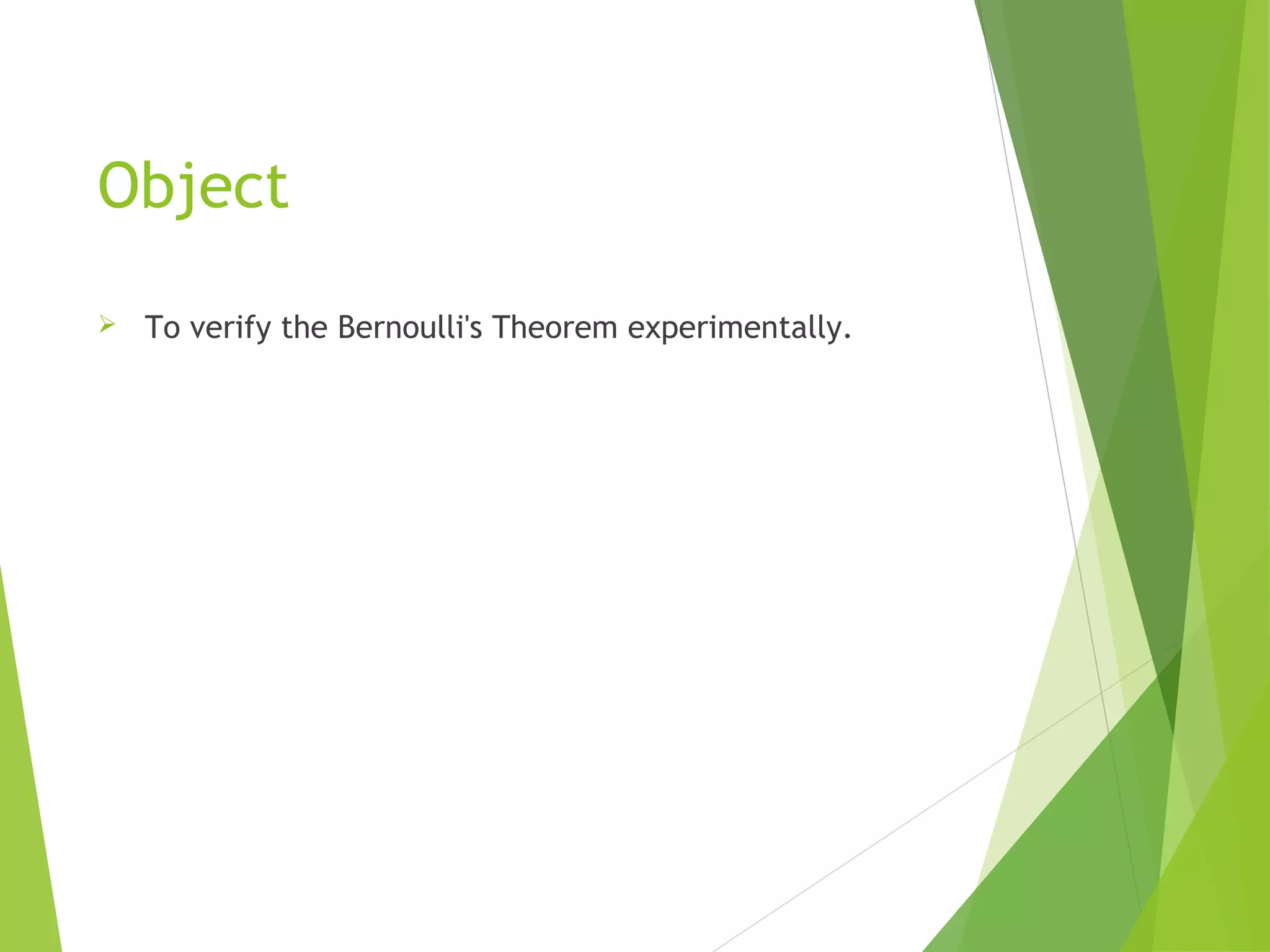 This document describes an experiment to verify Bernoulli's theorem. Bernoulli's theorem states that for an inviscid, incompressible fluid flowing steadily through a closed passage, the total energy at any point remains constant. The experiment involves measuring the pressure, velocity, and elevation at different points in a diverging duct carrying water. Observations are recorded and used to plot the total energy line, which should be horizontal according to Bernoulli's theorem. The results support the theorem by showing the total energy remains constant despite changes in pressure, velocity, and elevation along the duct.