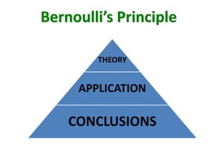Bernoulli's principle states that an increase in the speed of a fluid occurs simultaneously with a decrease in pressure. The principle was introduced by Daniel Bernoulli in 1738 and describes the behavior of incompressible, non-viscous fluids. It explains various phenomena like aircraft lift, spoiler function, tennis ball motion, and carburetor/venturi tube operation. The document covers the theory, equation, and various applications of Bernoulli's principle.