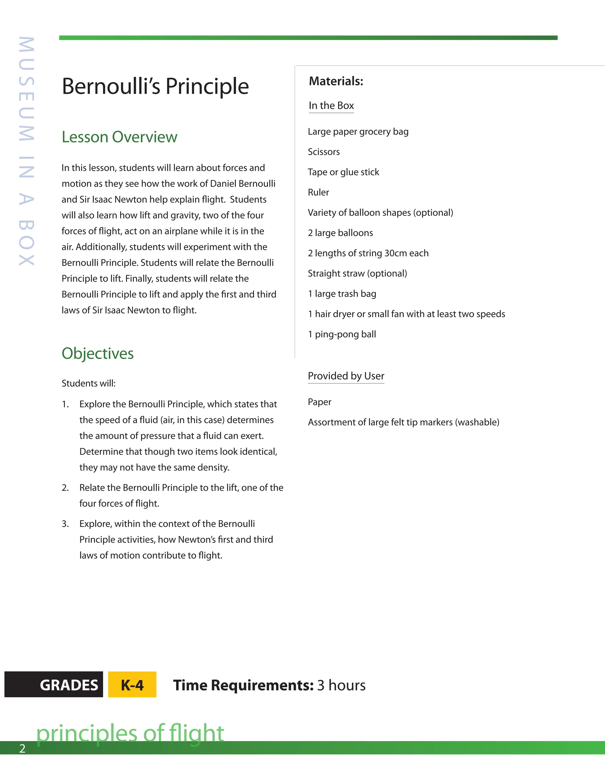This document outlines a lesson plan for students in grades K-4 about aerodynamics, focusing on the Bernoulli principle and Newton's laws of motion as they relate to flight. Students will learn how lift and gravity affect airplanes, engage in hands-on activities like making a paper bag mask and conducting experiments with balloons to observe air pressure changes, and understand the scientific principles that allow airplanes to fly. The lesson aims to promote inquiry and understanding of the forces of flight through practical experiments and explanations.