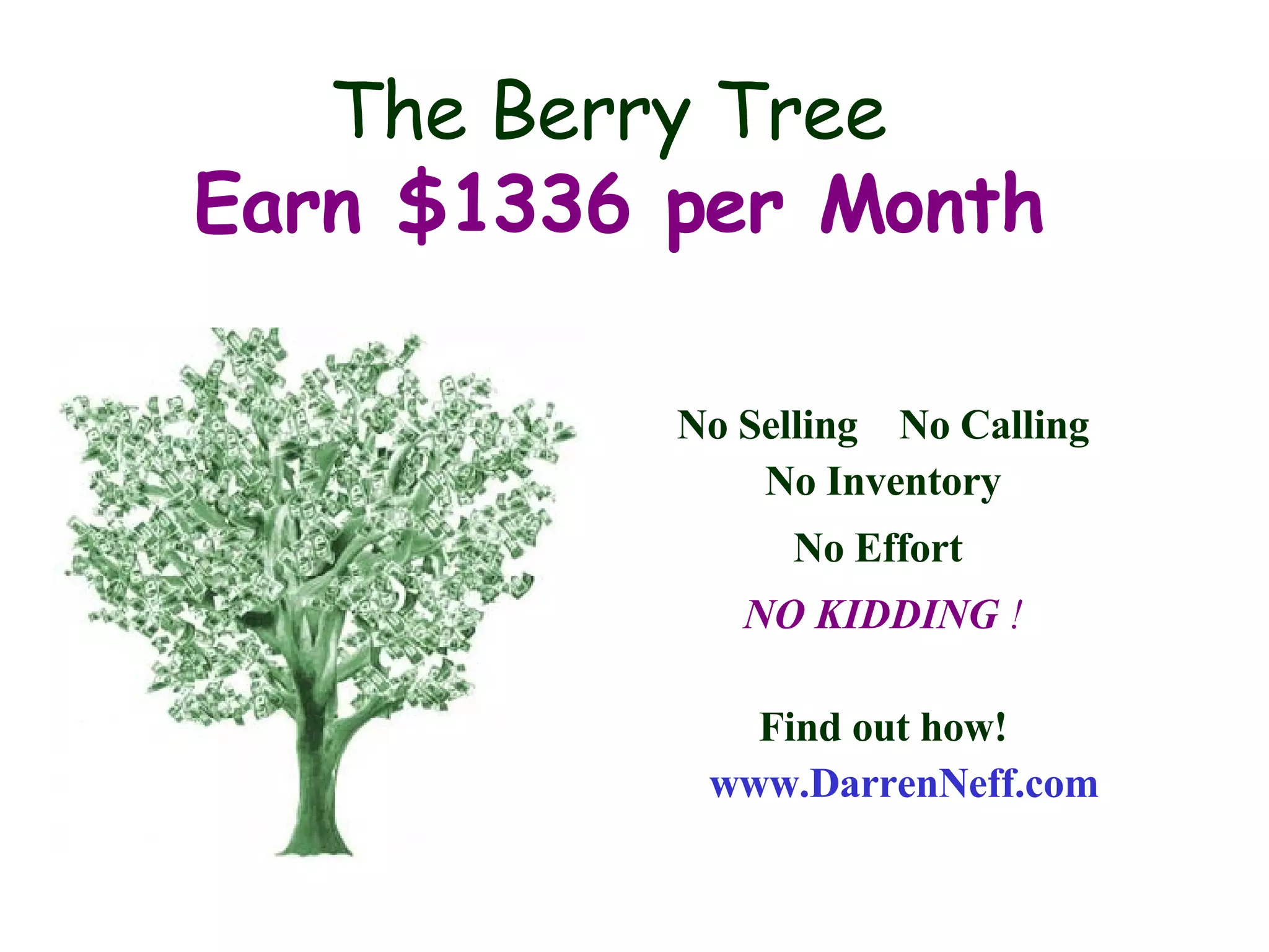 The Berry Tree is a business opportunity that allows members to earn $1336 per month passively without selling, calling, or having inventory. Members pay a low monthly fee, and the company's advertising automatically grows their business by bringing in new members. While earnings start small, profits steadily increase as more people join under existing members. Within a few months, earnings can cover the monthly membership fee, resulting in no further costs. The opportunity has the potential to generate a $1336 monthly income much faster and at lower cost than traditional savings or investment methods.