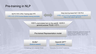 BERT is a deeply bidirectional, unsupervised language representation model pre-trained using only plain text. It is the first model to use a bidirectional Transformer for pre-training. BERT learns representations from both left and right contexts within text, unlike previous models like ELMo which use independently trained left-to-right and right-to-left LSTMs. BERT was pre-trained on two large text corpora using masked language modeling and next sentence prediction tasks. It establishes new state-of-the-art results on a wide range of natural language understanding benchmarks.