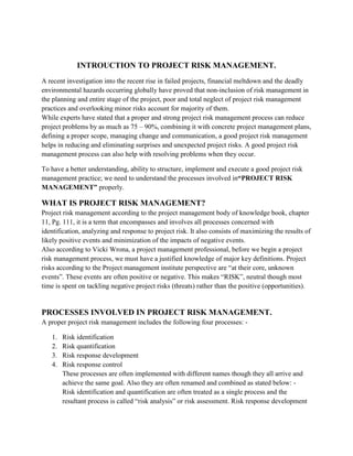 The document discusses project risk management processes and their importance. It defines project risk management as involving identification, analysis and response to project risks. The key project risk management processes are risk identification, risk quantification, risk response development, and risk response control. These help manage threats and opportunities throughout the project lifecycle. Effective risk management can significantly reduce project problems and failures.