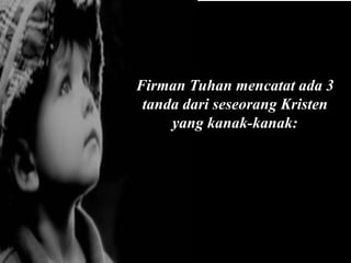 Dokumen ini membahas tiga tanda seseorang Kristen yang masih kanak-kanak secara rohani, yaitu tidak fokus kepada Yesus, tidak mampu bertahan terhadap firman Tuhan, dan tidak bisa membedakan antara yang baik dan jahat. Contoh yang diberikan adalah pemindahan tabut perjanjian oleh Daud, di mana kesalahan terjadi karena tidak mengikuti petunjuk Tuhan. Kesimpulannya, Roh Kudus akan membimbing kita menuju kedewasaan rohani yang penuh.