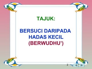 Dokumen ini membincangkan tentang berwudhu' dalam pendidikan Islam, termasuk makna, tujuan, rukun-rukun, serta sunat-sunat wudhu'. Berwudhu' dilakukan dengan niat dan mengikuti langkah-langkah tertentu, serta mempunyai kelebihan seperti menghapuskan dosa dan menjaga kebersihan. Penekanan juga diberikan untuk mengamalkan berwudhu' sebagai cara untuk mencapai minda dan tubuh yang sihat.