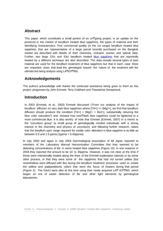 This document provides an update on the market presence of beryllium treated blue sapphires, detailing their identifying characteristics through analysis of five commercial quality stones and larger variants. The examination included their chemistry, inclusion scenes, and optical data, with findings indicating variations in beryllium levels and treatment processes. It emphasizes the necessity of analytical methods like la-ICP-MS for accurate identification and the complexity of treatment effects on sapphire coloration.