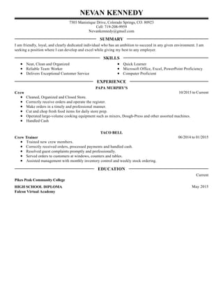 This document is a resume for Nevan Kennedy providing essential information in 3 sentences. It summarizes that Nevan is seeking a position where he can develop and excel while giving his best. His resume lists skills including being neat, clean, organized, a reliable team worker, and having excellent customer service and computer skills. For work experience, it provides that Nevan worked as a crew member at Papa Murphy's and Taco Bell where his duties included food preparation, handling cash, and training new employees.