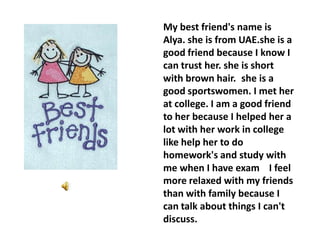 Alya is the narrator's best friend from the UAE who they met in college. She has brown hair and is a good athlete. The narrator feels they are a good friend to Alya because they helped her with homework and studied together for exams. The narrator feels more comfortable discussing things with friends rather than family.