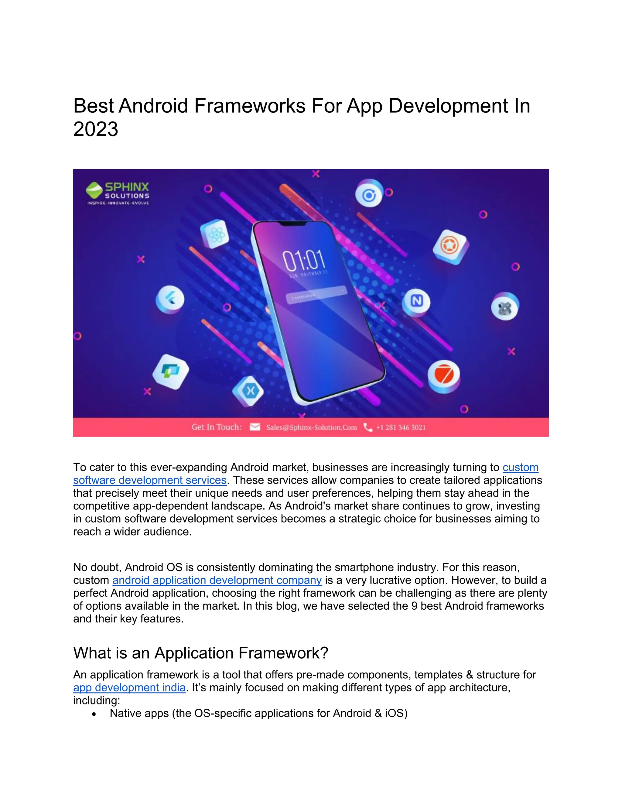 The document discusses the importance of selecting the right Android framework for app development, noting the growth of the Android market and the demand for custom software solutions. It highlights nine top Android frameworks including Ionic, Flutter, and React Native, detailing their features, capabilities, and developer benefits. The article emphasizes how these frameworks can streamline the development process and enhance app performance across various platforms.