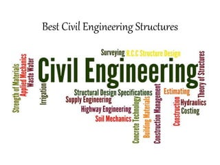 The document lists some of the best civil engineering structures around the world, including the Akashi Bridge, Burj Khalifa, and the Eiffel Tower. It highlights a variety of iconic sites from different regions, such as the Taj Mahal and the Colosseum of Rome. These structures are recognized for their architectural significance and engineering innovation.