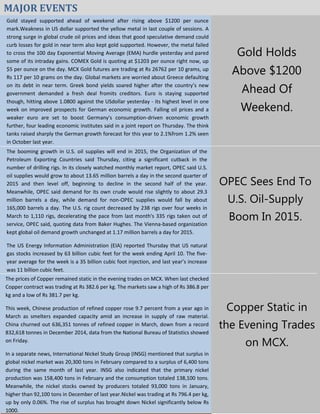 During April 20-24, 2015, gold prices remained supported above $1200 per ounce due to a weaker US dollar and surging crude oil prices, though it struggled to surpass significant resistance levels. Concerns about Greece's debt situation affected global markets, while OPEC indicated a possible end to the US oil supply boom as drilling activity decreased. In metals, copper prices stabilized amid increased Chinese production, and nickel experienced a surplus in the global market, keeping its prices under 1000 rupees per kg.