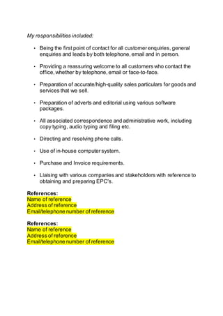 This CV summarizes the contact details, skills, qualifications, and work experience of an individual seeking employment. They have extensive experience as a JOB ROLE HERE and have a reputation for professionalism, customer service, and commitment to high standards. Their qualifications include LIST QUALIFICATIONS HERE and they have experience with software such as WORD, EXCEL, and POWERPOINT. Their previous work experience includes a role at EmployerX, where they performed duties like customer service, record keeping, correspondence, and administrative tasks for over X years.