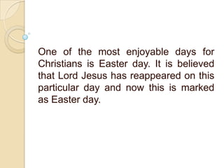 The document discusses enjoyable Easter Day activities for kids, highlighting the importance of crafts, gift exchanges, and games. It emphasizes that children bring joy and creativity to the celebration, engaging in activities that foster happiness and connection with family and friends. The text underlines that these experiences contribute to memorable moments during the special occasion of Easter.