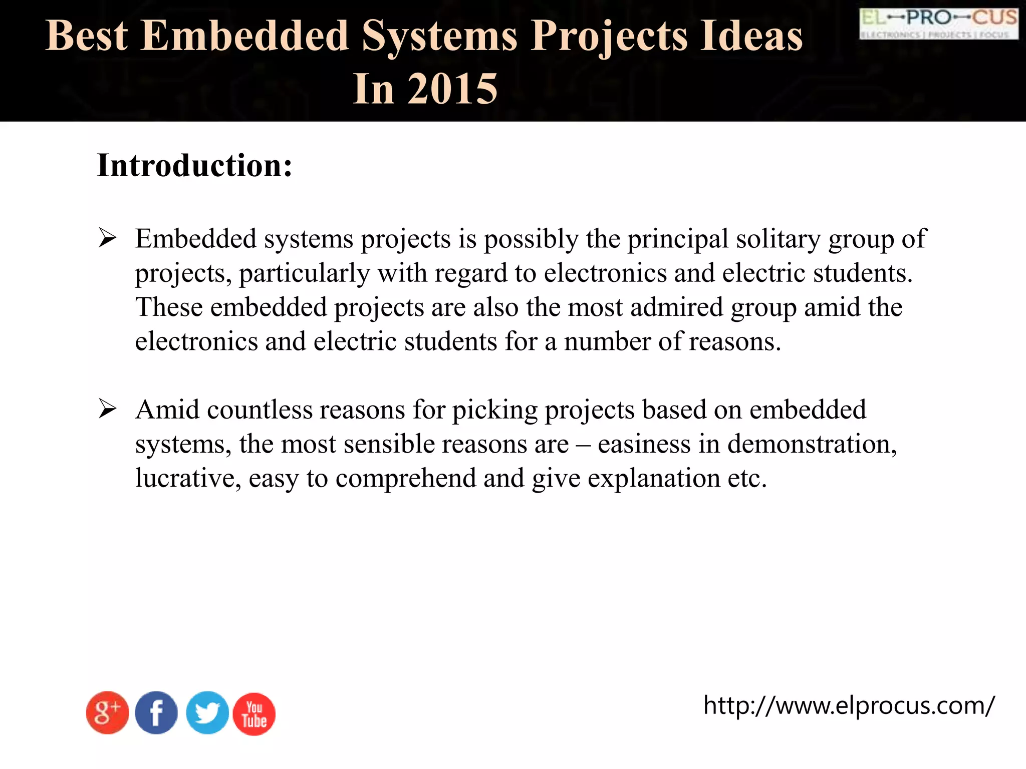 The document outlines several innovative embedded systems project ideas from 2015, highlighting their applications in various fields such as automation, traffic monitoring, and security. Key projects include a mobile-operated SCADA system for industrial control, a temperature-controlled fan, and a solar tracking system for optimal energy generation. Overall, these projects illustrate the versatility and importance of embedded systems in modern technology.