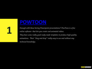 PowToon is a free online software that allows users to create animated videos through drag and drop templates without technical knowledge. Prezi allows presentations on an open canvas with motion to engage audiences. Animaker offers 5 video styles and 120 animations to create explainer videos. GoAnimate isn't free but produces professional quality animations quickly through templates. Biteable is a free video maker that allows HD video publishing to YouTube.