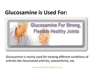 Glucosamine is a compound formed in the body that is found in cartilage and is commonly used in joint supplements for treating arthritis conditions. It helps reduce pain and inflammation, supports cartilage repair, and improves joint function and mobility. Precautions include monitoring glucose levels for diabetics and avoiding it if allergic to shellfish, though alternatives are available.