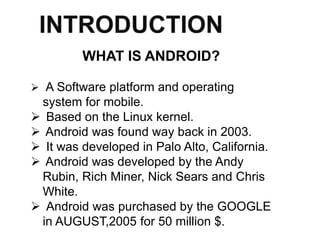 Android is a mobile operating system developed from the Linux kernel, founded in 2003 and purchased by Google in 2005. It allows for extensive application development via its SDK and offers numerous connectivity features, enhancing user experience with millions of apps. The OS has evolved through multiple versions since its initial release in 2008, incorporating numerous enhancements and becoming a leading mobile platform globally.