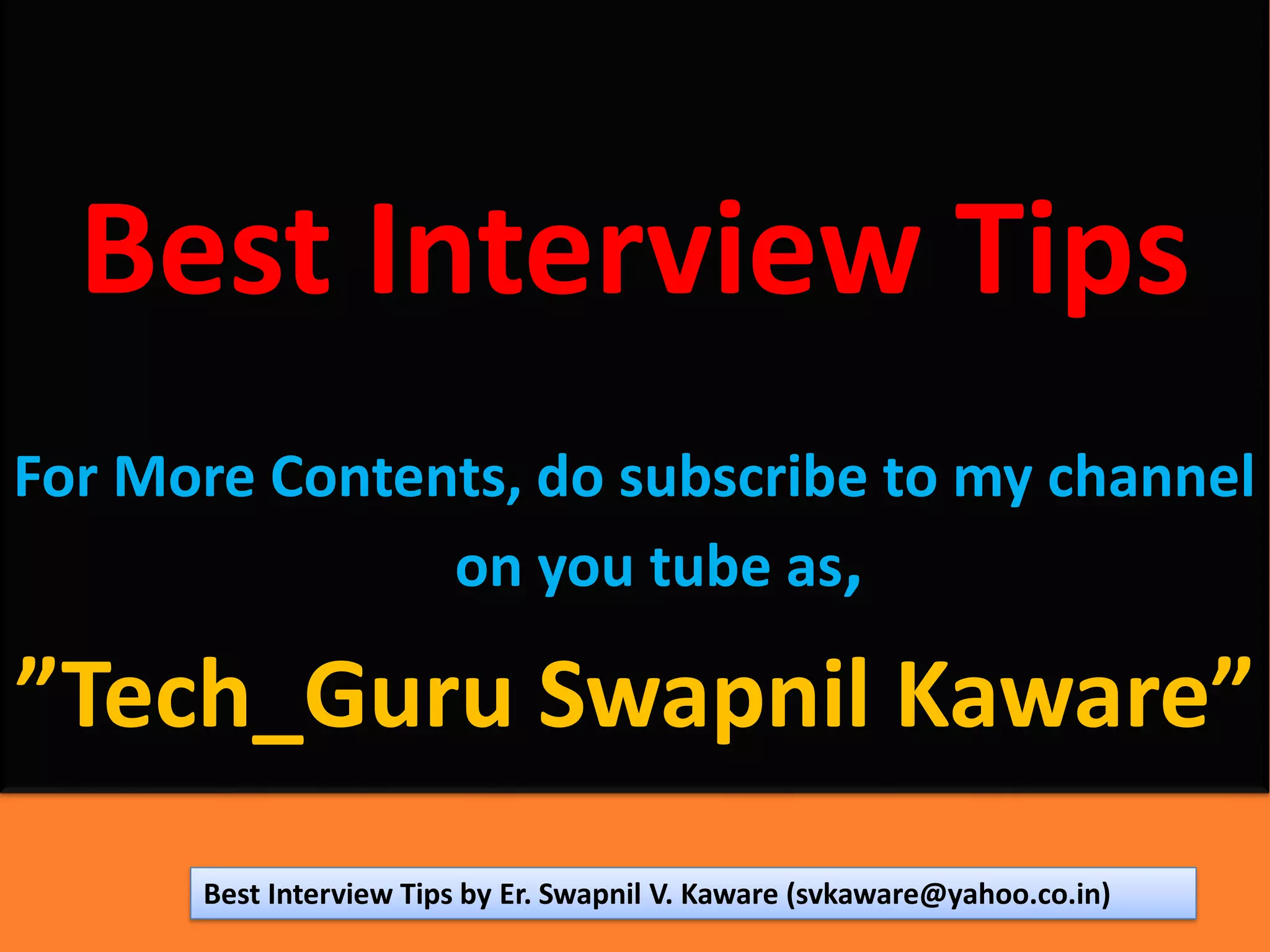 The document provides 18 interview tips for job candidates. It discusses common interview questions and recommends focusing answers on relevant qualifications and experiences, providing concrete examples, and relating skills to the position. For questions about gaps in employment, the document advises discussing positive activities like volunteering. It also recommends researching the company beforehand to demonstrate interest in the role.