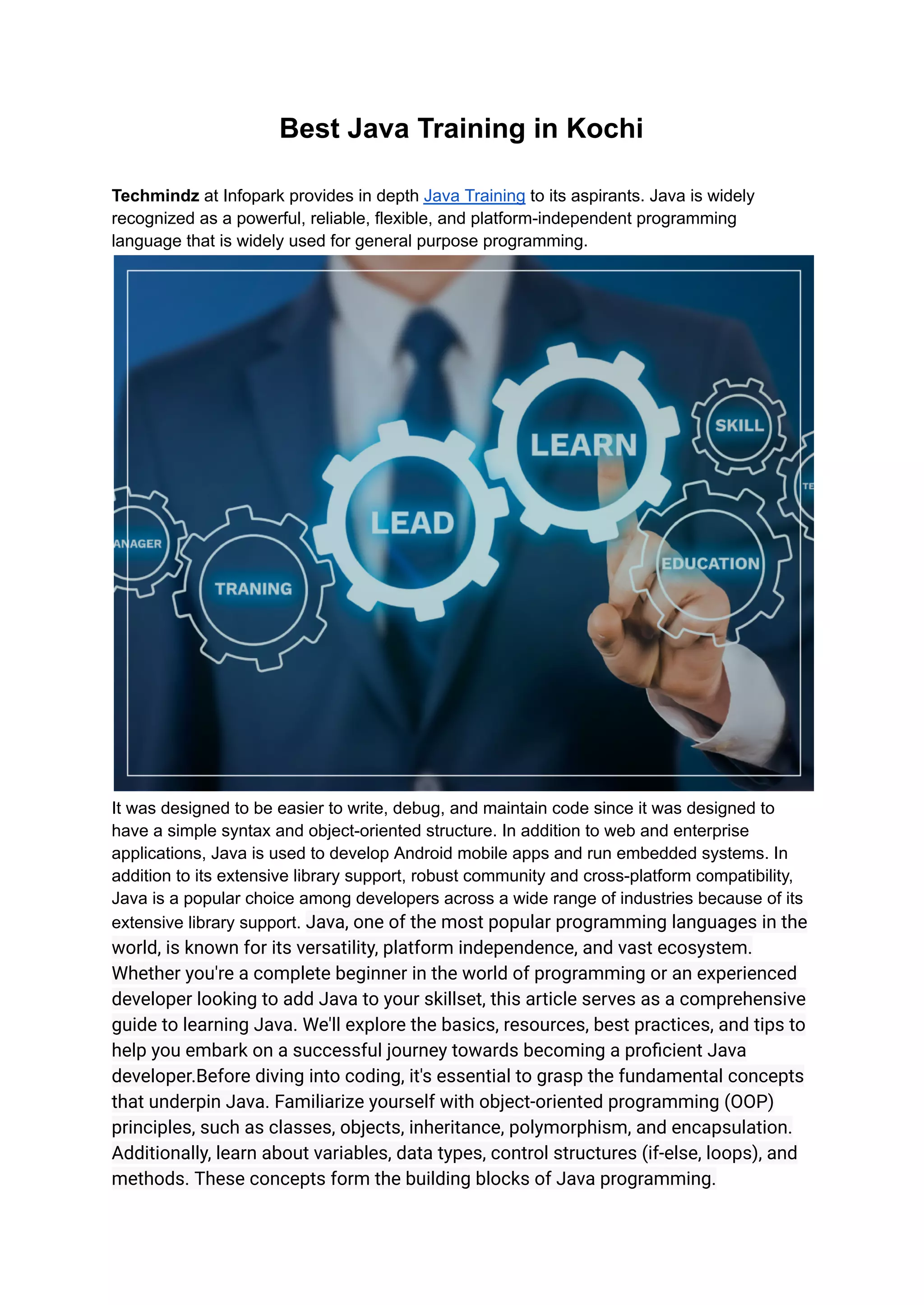Techmindz at Infopark offers comprehensive Java training in Kochi, designed for both beginners and experienced developers. Java is a platform-independent programming language known for its versatility, strong community support, and extensive libraries, making it popular across various industries. The training covers fundamental concepts of object-oriented programming and best practices for becoming a proficient Java developer.