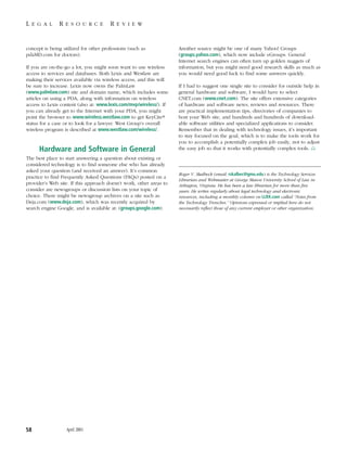This document provides resources for finding reviews of legal software and hardware. It begins by recommending the Lawyerware site for reviews across various legal practice areas. Other review sources mentioned include Law Office Computing magazine, Law Technology News, the ABA and Virginia Bar Association websites. The document also discusses legal content and applications available for PDAs, as well as wireless access to legal databases. It recommends CNET.com as a general technology resource for hardware, software and implementation tips.