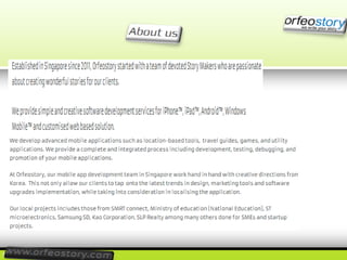 Orfeostory is a mobile app development and creative web design company. They provide services for app development and web design. Their website is located at http://www.orfeostory.com/.