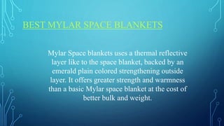 Mylar space blankets use a thermal reflective layer similar to space blankets backed by an emerald colored strengthening outer layer. This offers greater strength and warmth than a basic Mylar space blanket at the cost of increased bulk and weight.